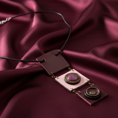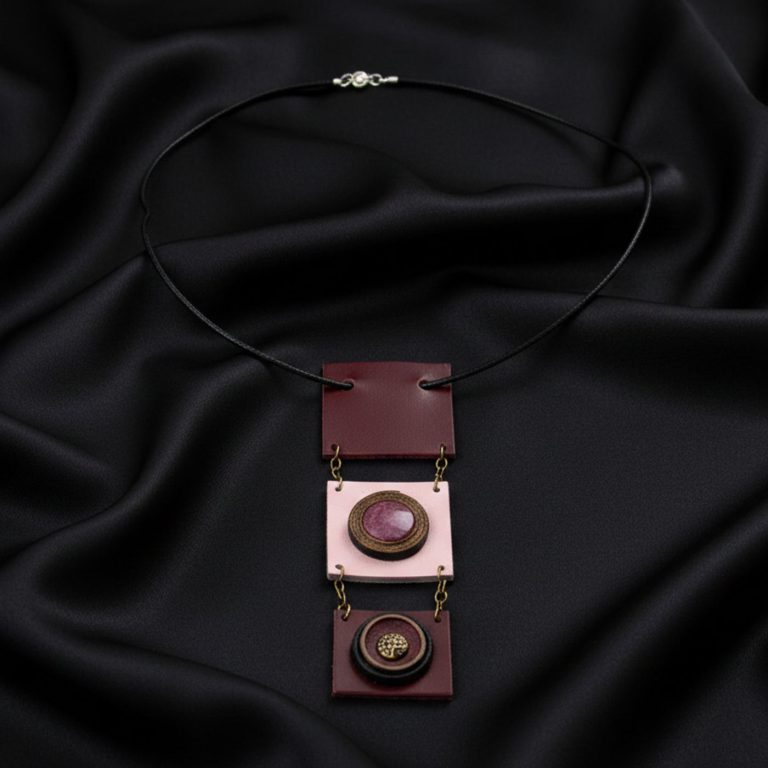 Կաշվե ձեռագործ կախազարդ վարդագույն քվարցով 5x13սմ