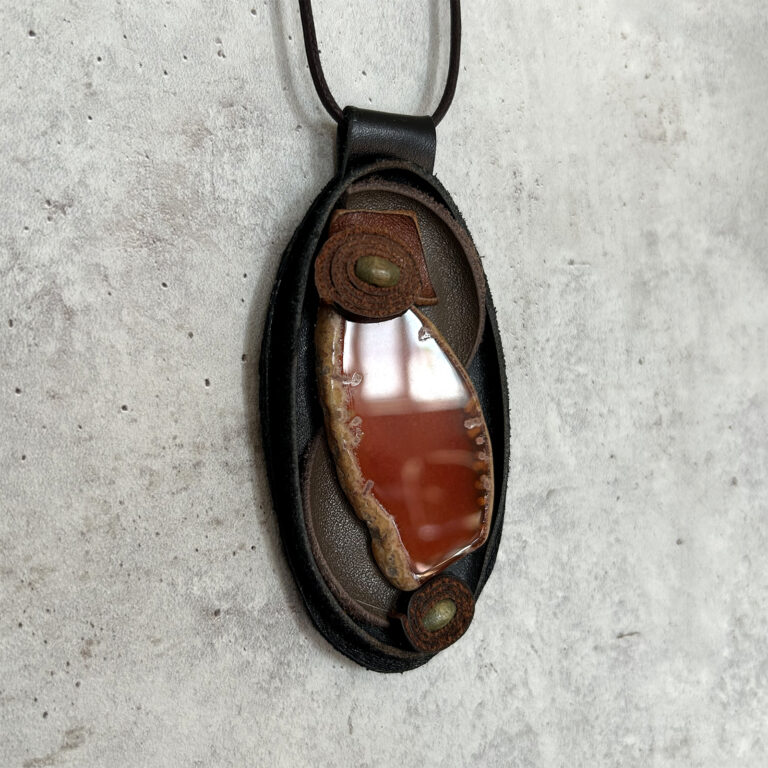 Կաշվե ձեռագործ կախազարդ լեռնային բյուրեղապակիով և ագաթով 5x9.5սմ